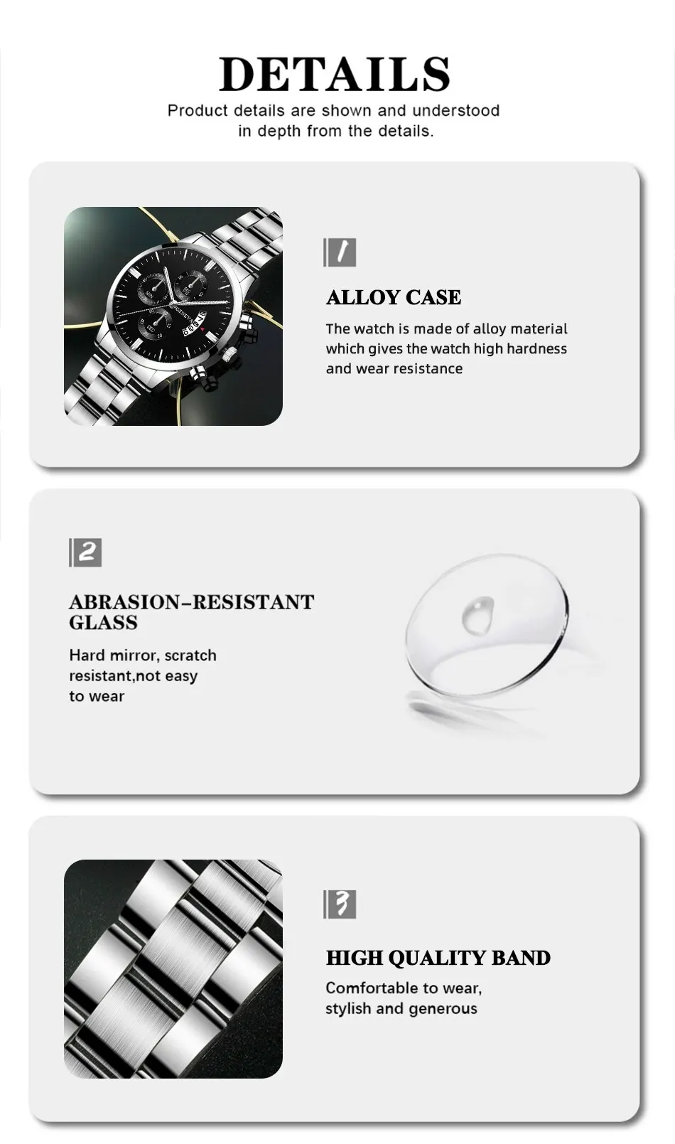 • Ventana de marcación Hardlex :La Ventana del dial del reloj está hecha de hardlex, un tipo de cristal mineral que es resistente a los arañazos y duradero.